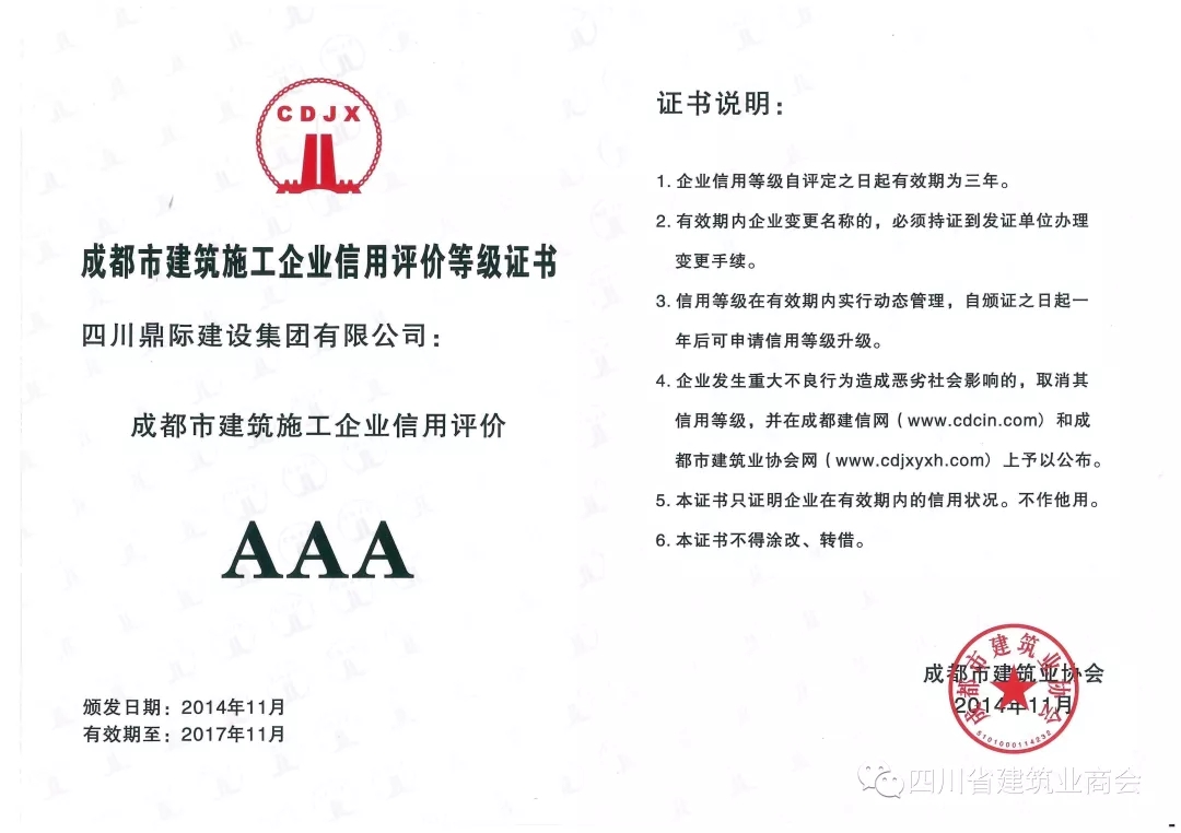 四川鼎际将一如既往地遵循重质量、重安全、精心施工、细节完善、至善至美、科学管理、环保安全、诚信守法、持续改进的方针,为社会奉献建设精品。公司将在竞争日益激烈的建筑市场中不断学习、开拓、发展、壮大,以一流的工程质量和优质的服务赢得回报社会。