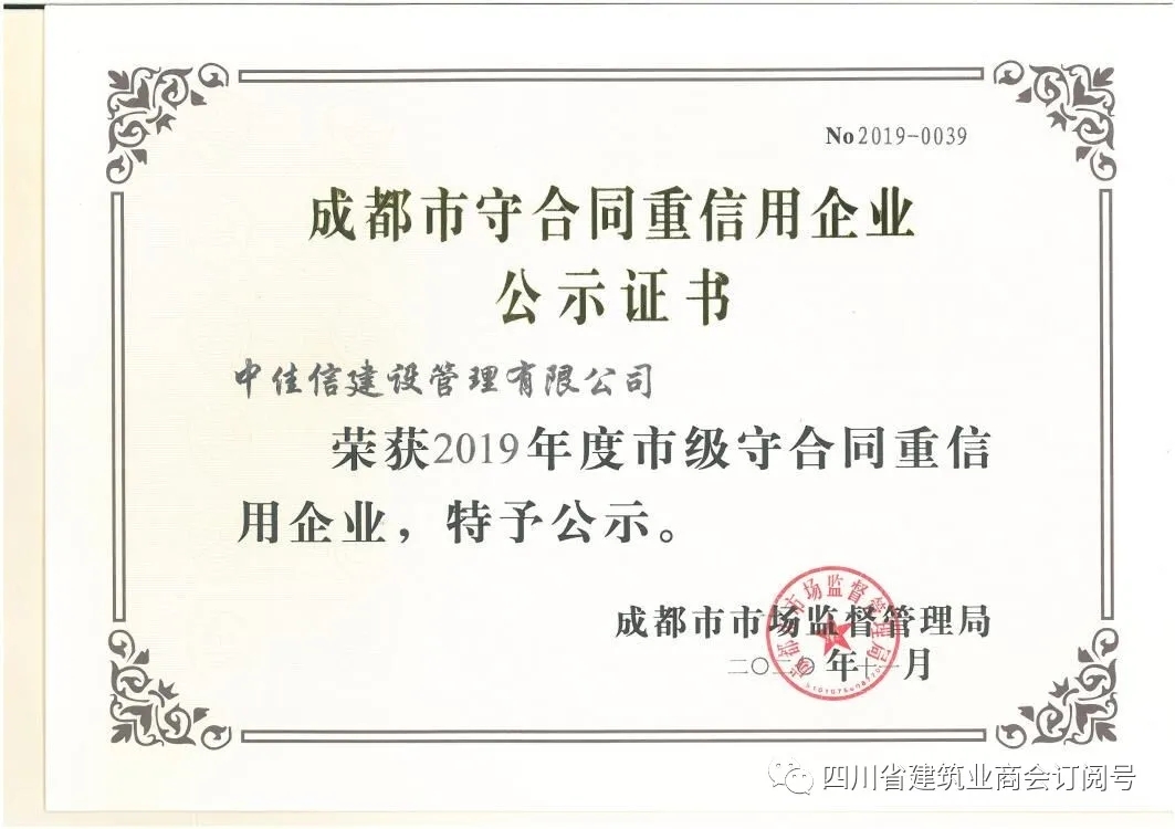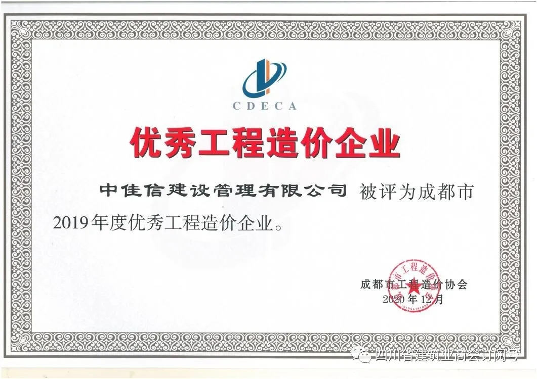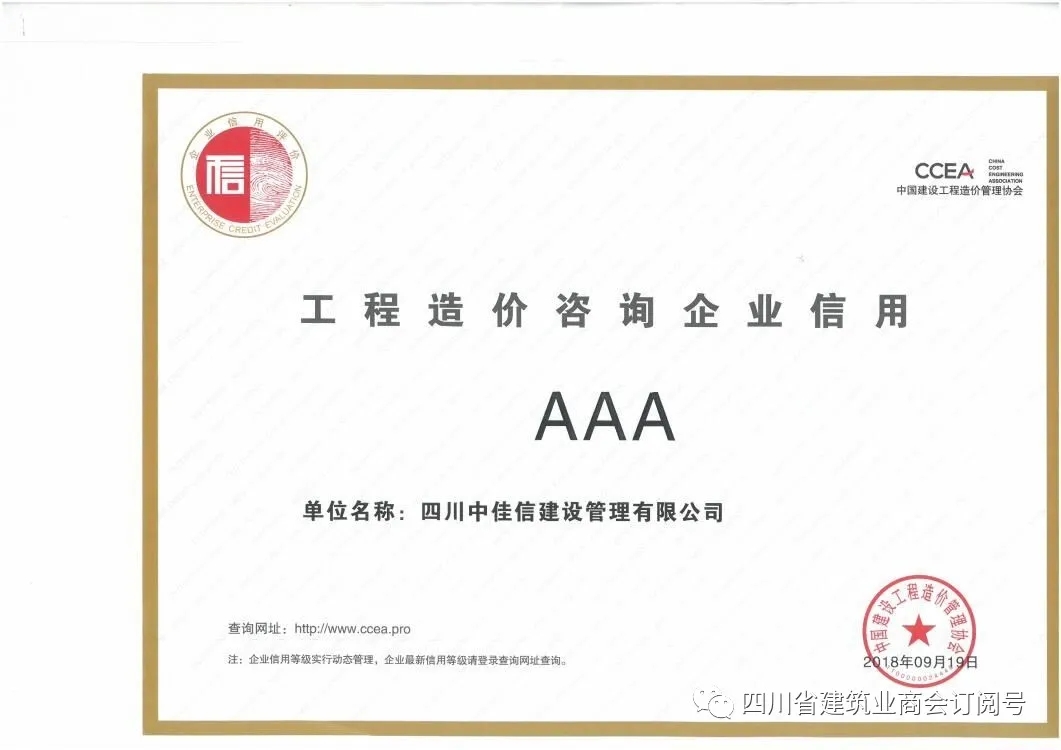 公司采用现代化企业管理模式,现已具备工程造价咨询甲级资质和工程监理、工程施工管理、工程咨询、工程招标代理、政府采购代理等资质,能够提供全方位的过程工程咨询的集成化专业服务。另外,我公司因保持着“专业高效,诚信敬业”的良好企业作风,多次被中国建设工程造价管理协会评为了“企业信用评价AAA级信用单位”,还先后被省、市级工程造价协会评为“优秀工程造价企业”称号,被多家业主单位授予“守合同、重信用”、“优质合作单位”等称号。通过在业内15年的砥砺深耕,在各级领导的关心和社会各界的支持下,历经几代创业者和广大员工的不懈努力,中佳信现已经成为四川省工程建设招标投标协会理事单、成都市造价工程协会常务理事单位和中国建设工程造价管理协会、中国工程项目管理协会、中国招投标协会、四川省工程造价师协会、四川省建设监理协会的会员单位。