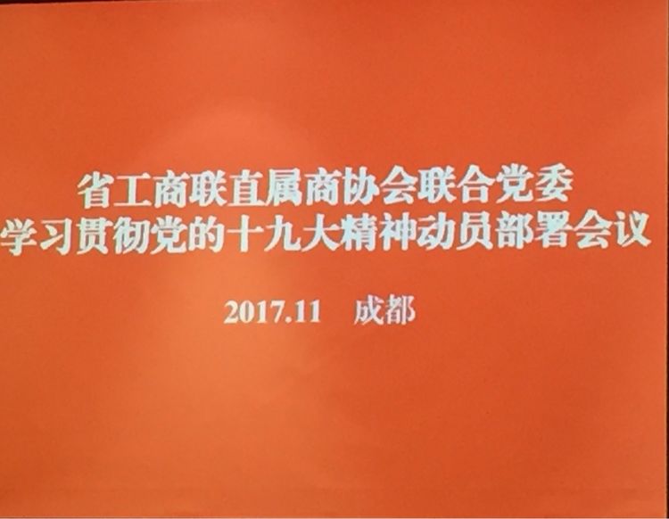 2017年11月15日下午,省工商联直属商协会联合党委副书记、四川省建筑业商会会长漆贵春参加了省工商联直属商协会联合党委在成都召开的学习贯彻党的十九大精神动员部署会议,并传达了省委关于认真学习贯彻党的十九大精神的通知。在会上,省工商联直属商协会联合党委副书记廉南代表党委部部署了联合党委学习贯彻党的十九大精神相关工作;省委统战部副部长、省工商联党组书记钟家霖宣讲了党的十九精神;最后,参会党员讨论交流了学习党的十九大精神体会。