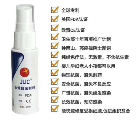 四、JUC经江苏省疾病预防控制中心检测,JUC一次喷洒在皮肤表面,8小时后抑菌率为99. 85%,一次喷洒在织物表面, 洗涤40次后抑菌率为99. 96%;