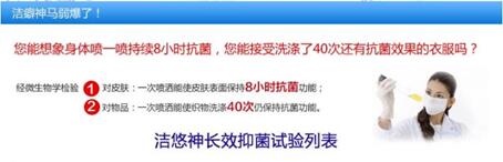 洁悠神,又称长效抗菌材料,主要成分是有机硅季铵盐(1-3%),属物理抗菌喷雾材料。洁悠神喷洒在皮肤表面,形成正电荷膜杀灭和隔离病原微生物(包括细菌、真菌和病毒)物理抗菌,能避免耐药菌产生及抗菌药物引起的生物耐药性这一严重问题。