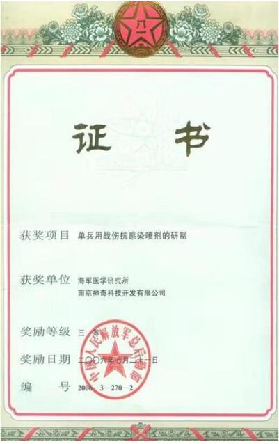 五、中国人民解放军总后勤部授予本产品“单兵用战伤抗感染喷剂的研制”三等奖殊荣;为我军战士们作战、训练保驾护航;