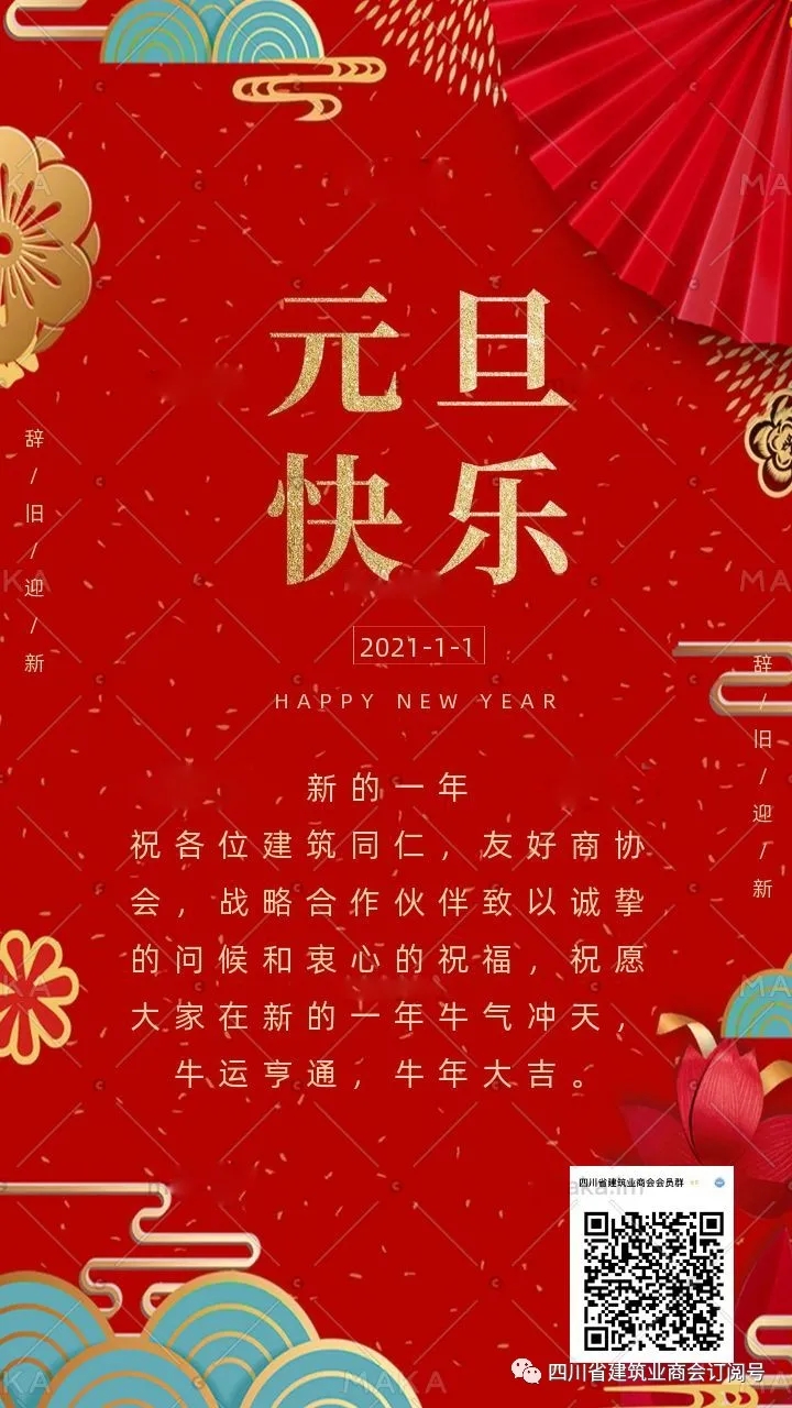 2020年已悄然离去,2021年正阔步前来,在此辞旧迎新之际,四川省建筑业商会会长漆贵春携商会领导班子向各位领导,各位建筑同仁,友好商协会,战略合作伙伴致以诚挚的问候和衷心的祝福,祝愿大家在新的一年牛气冲天,牛运亨通,牛年大吉。