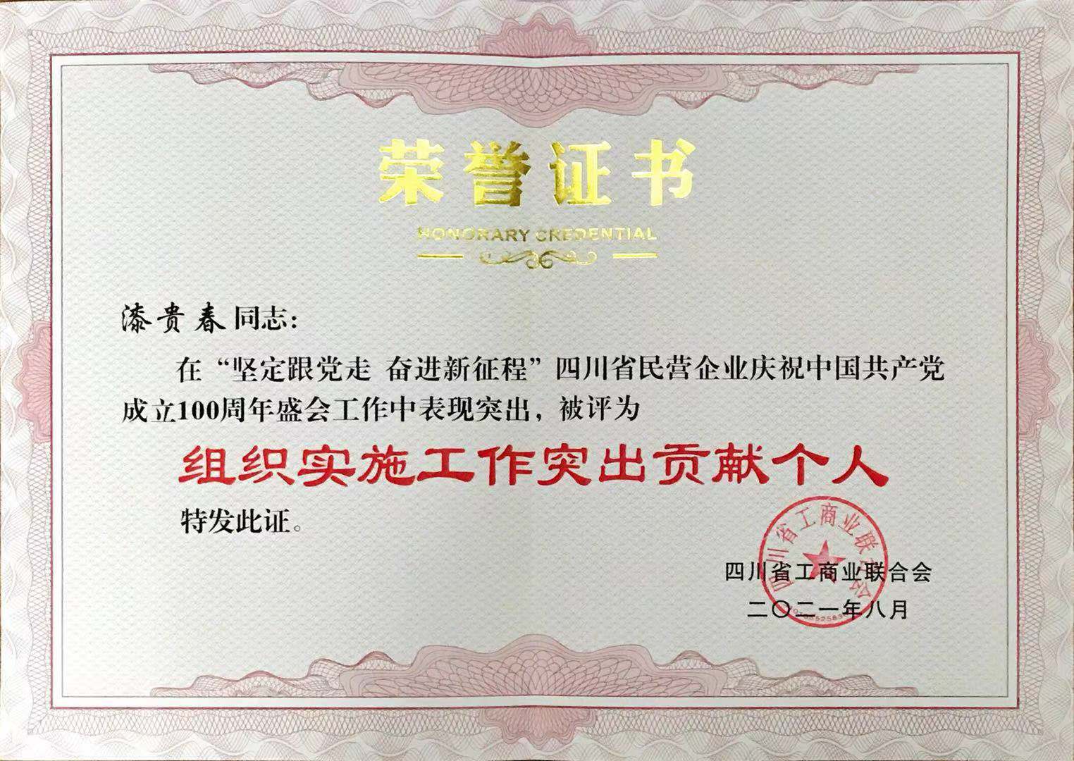 会上一级巡视员陈建宣读了《四川省工商业联合会关于表扬为庆祝中国共产党成立100周年盛会作出突出贡献的单位和个人的通报》,随后进行颁奖仪式。四川省建筑业商会以及我会会长单位成都华建投资(集团)有限公司、副会长单位中诚投建工集团有限公司荣获“组织实施工作突出贡献单位”表彰;商会党委书记、会长漆贵春,会长单位李敏、李金财荣获“突出贡献个人”表彰;商会党委副书记、秘书长张红荣获“组织统筹工作突出贡献个人”表彰;商会党委委员、党支部书记廖子玉荣获“组织保障工作突出贡献个人”表彰。