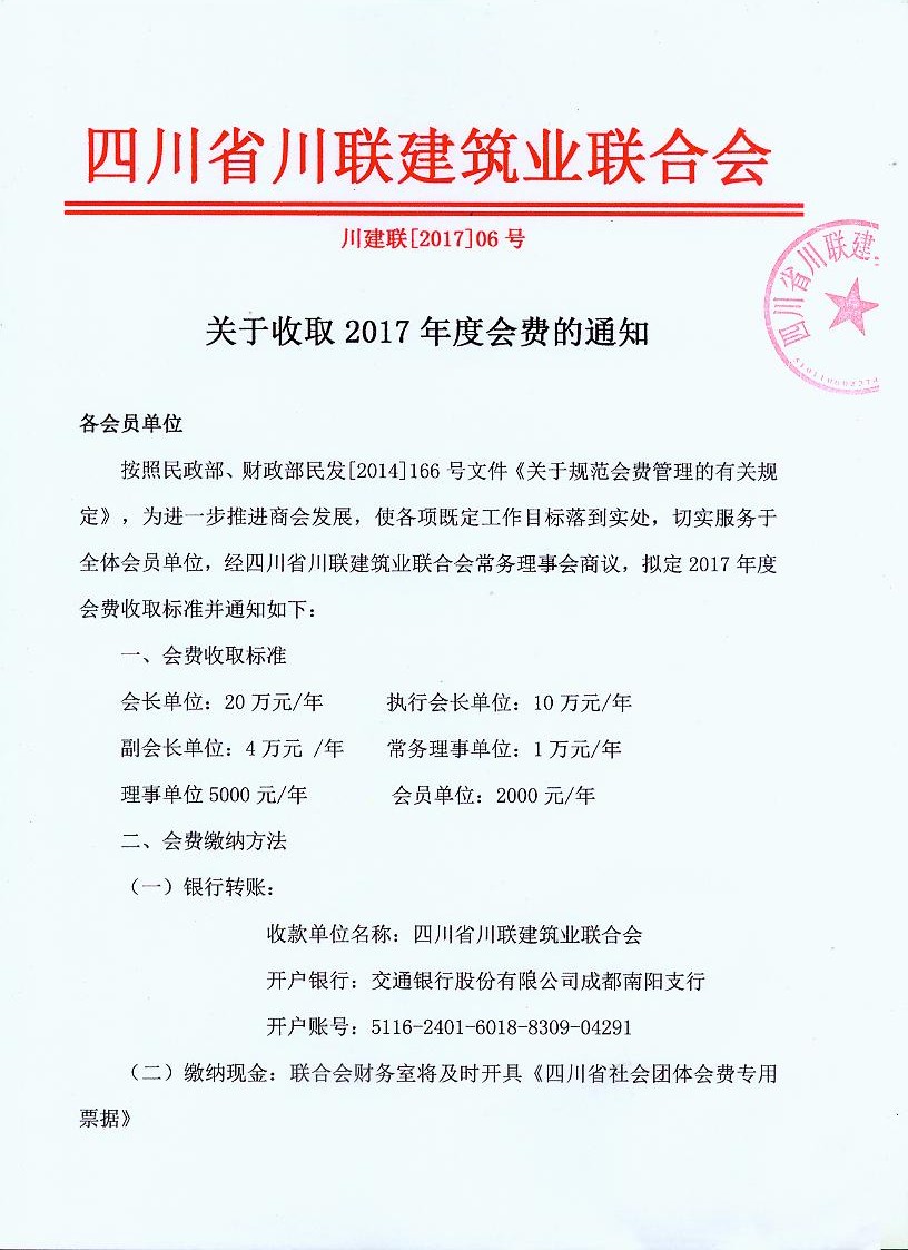 按照民政部、财政部民发[2014]166号文件《关于规范会费管理的有关规定》,为进一步推进商会发展,使各项既定工作目标落到实处,切实服务于全体会员单位,经四川省川联建筑业联合会常务理事会商议,拟定2017年度会费收取标准并通知如下: