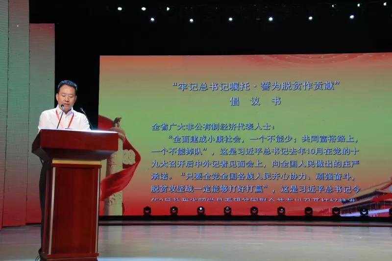 成都蛟龙港管理委员会主任黄玉蛟代表民营企业家宣读《牢记总书记嘱托 为脱贫攻坚作贡献》倡议书,号召全省广大非公有制经济代表人士积极投身脱贫攻坚事业,发挥独特优势,利用自身资源,结对帮扶贫困村;民营企业家应该主动担当做脱贫攻坚的积极参与者、应该绝对帮扶做脱贫攻坚的实践者、应该求真务实做脱贫攻坚的推动者,而扶贫是每一位非公有制经济人士都应尽的社会责任。