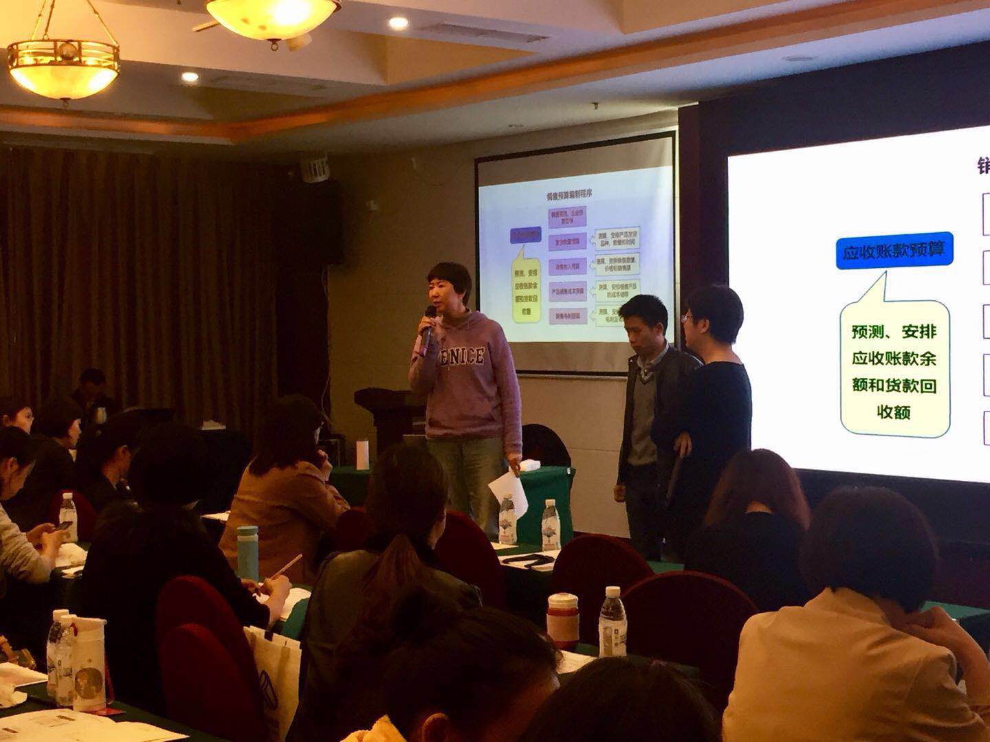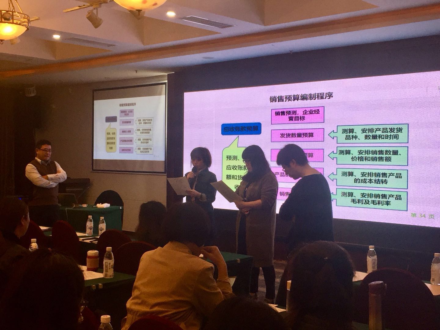 《第五章·预算的执行与监控》,在本章中,李老师首先讲了全面预算的编制内容应包括战略规划经营目标、资本预算、经营预算、财务预算,其中经营预算包含销售预算、生产预算、供应预算、期间费用预算、其他经营预算;资本预算包含固定资产投资预算、权益性资本投资预算、债券投资预算、其他投资预算、项目筹资预算。为了让学员们将理论更好的运用于实践,李老师将所有参训人员两排为一组,分成了六组,要求每一组学员开动思维、动起手指编制一个或多个以销售收入预算及销售策略为主题的表格,练习布置后,学员们纷纷进入讨论状态,大家集思广益,很快动手绘制起来。其中有两组学员选派代表到台前为大家做了热情洋溢的汇报展示及解说。