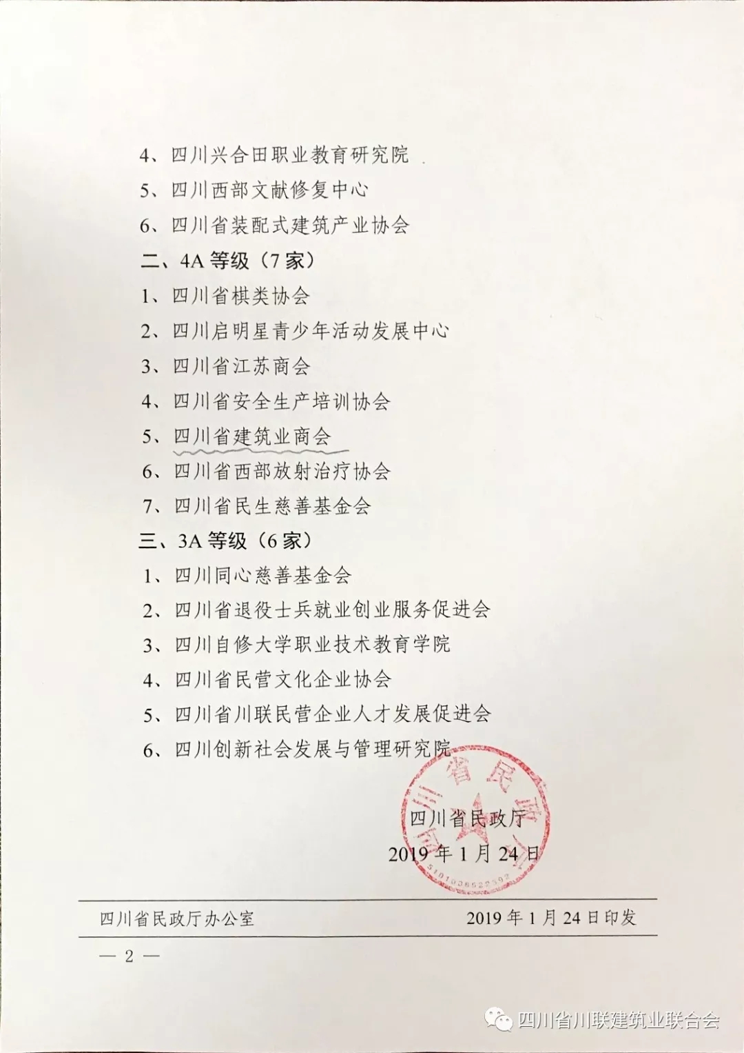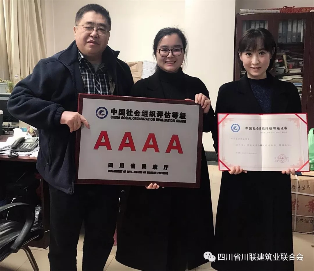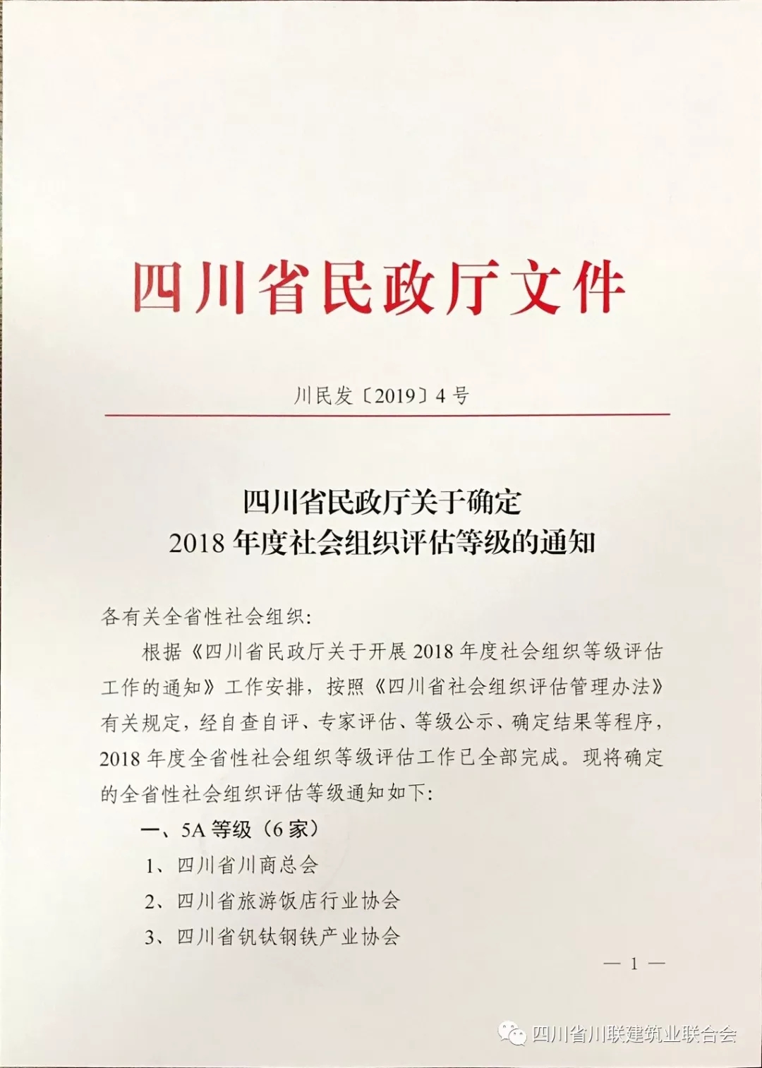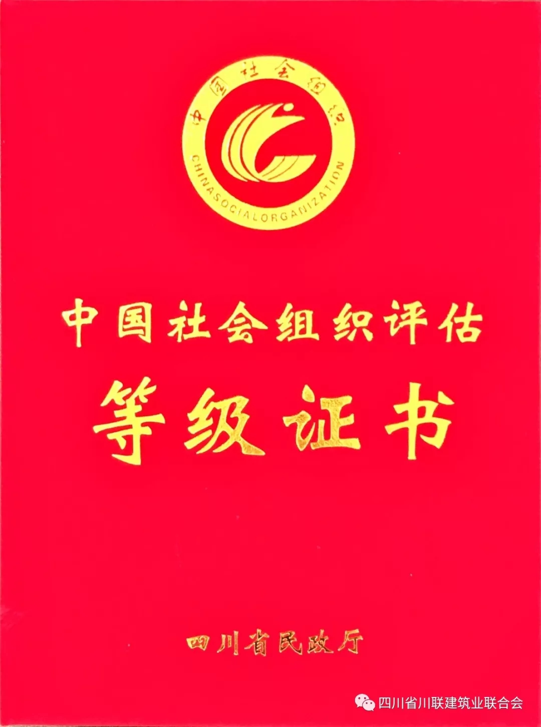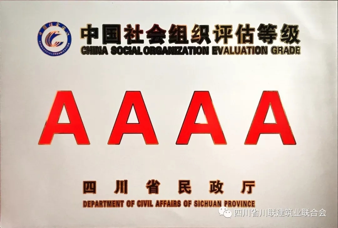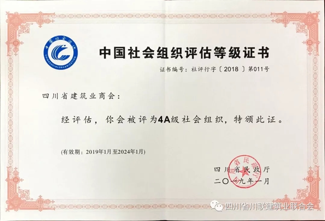 四川省民政厅2019年1月24日发布《关于确定2018年度社会组织评估等级的通知》(川民发〔2019〕4号),四川省建筑业商会被评定为4A级社会组织,并于1月28日接受正式授牌。
