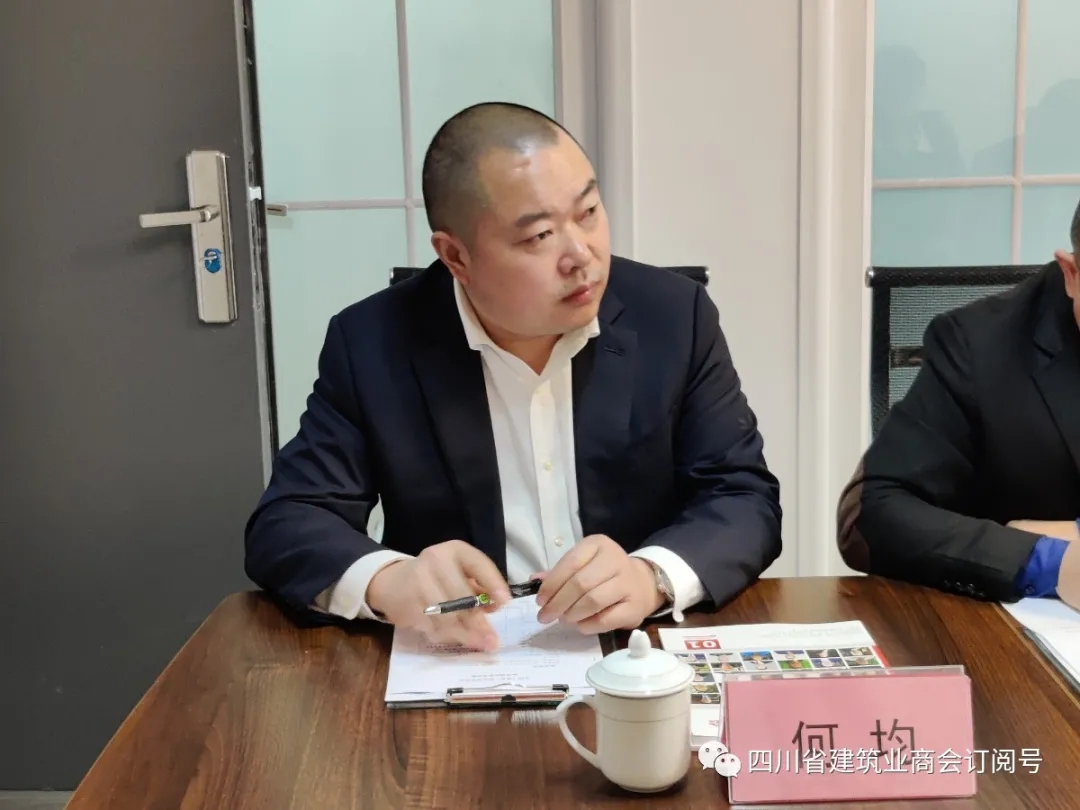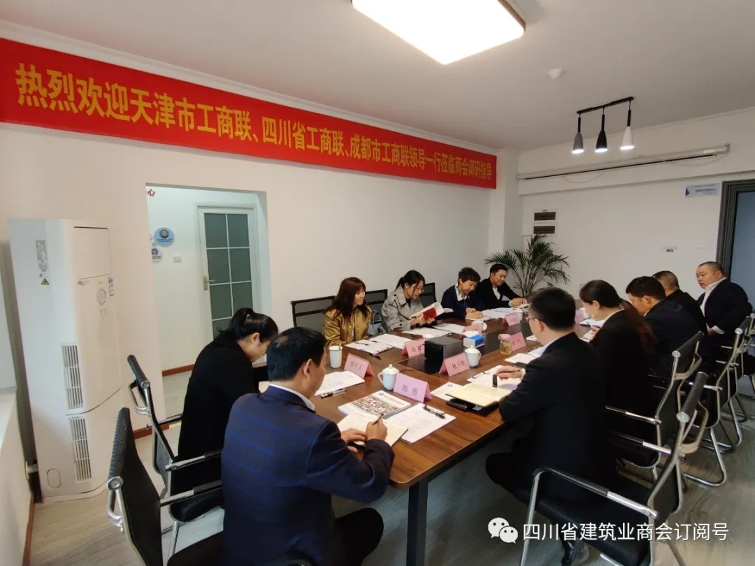 为贯彻落实全国工商联关于开展“四好”商会互学互促的通知精神,继四川省工商联赴天津市工商联走访调研后,2020年10月27日,天津市工商联党组副书记、副主席牛予其带领组织建设干部刘宏静,商协会会长、秘书长代表一行到四川省建筑业商会、成都市建筑行业商会开展座谈调研。四川省工商联党组成员、副主席、省工商联直属商协会联合党委书记孙宁;省工商联会员处二级调研员黄林;成都市工商联会员处副处长李磊陪同调研。四川省工商联副主席、成都市工商联副主席、四川省建筑业商会会长、成都市建筑行业商会会长、成都华建投资(集团)有限公司党委书记漆贵春;四川省建筑业商会工程设备租赁分会会长何均;四川省建筑业商会秘书长张红、党支部书记廖子玉;成都市建筑行业商会秘书长徐万明参加调研。