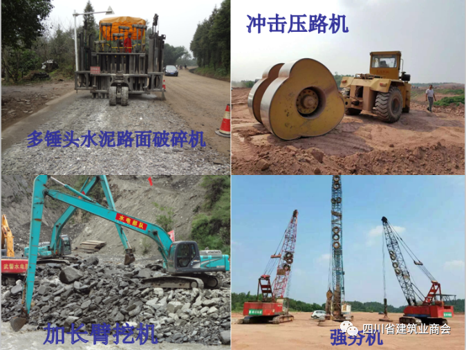 路基土方设备有:三一485型钩机、神钢495型加强臂钩机、短臂175-210型破碎锤炮机、日立750型/870型岩石臂破岩机、斗山500钩机、斗山420钩机、冲击压路机(冲击碾)、平地机、单钢轮压路机、推土机、挖掘机、加长臂挖机、羊角碾、强夯。