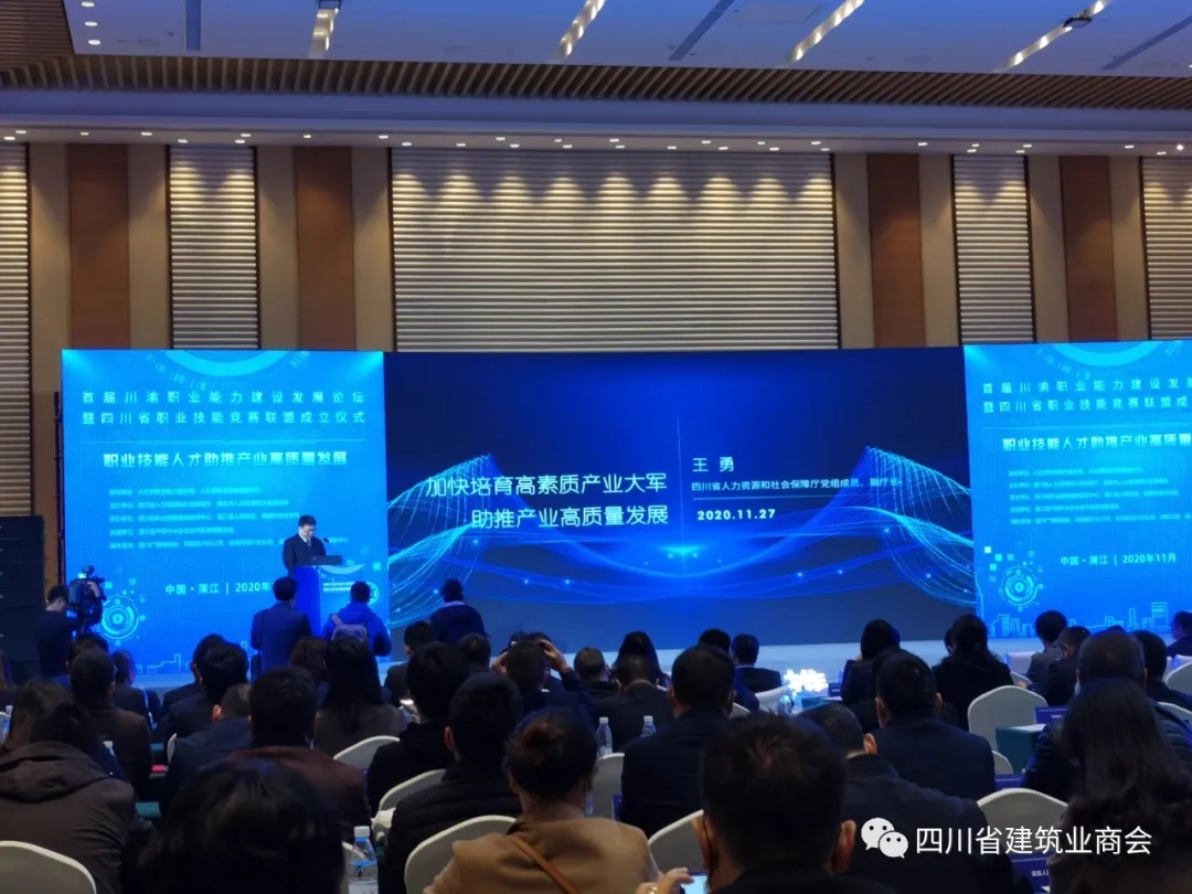 2020年11月27日,秘书处曾云勇参加由人社部职业能力建设司、人社部职业技能鉴定中心指导,四川省人力资源和社会保障厅、重庆市人力资源和社会保障局主办,四川省职业技能鉴定中心、蒲江县人民政府、成都市技师学院共同承办的“首届川渝职业能力建设发展论坛暨四川省职业技能竞赛联盟成立仪式”。本次活动旨在贯彻落实川渝人社合作协议,推动成渝地区双城经济圈职业能力建设协同发展,整合全省职业技能竞赛的发展成果,转换应用于现代工业、现代农业、现代生产服务业等领域的技能人才培育“一体化”方式,对标国际国内先进生产技术、高科技产业领域、智能化工业农业等发展前沿,打造一流的技能人才队伍培育评价标杆,从而有力助推产业发展的提能升级,营造劳动光荣、技能宝贵、创造伟大的社会风尚。四川、重庆各职能部门、在川央企、国企、高职院校以及省内各商协会400余人参加本次大会。莅临本次会议的主要领导有人社部职业技能鉴定中心、中国就业培训技术指导中心二级巡视员陈卫军、四川省人社厅党组书记、厅长胡斌、重庆市人社局党组成员、副局长谢辛等。