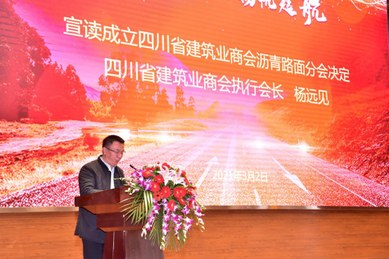 省建筑业商会执行会长杨远见宣读《关于成立四川省建筑业商会沥青路面分会的决定》。
