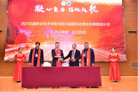 会上举行了授牌仪式和签约仪式。授牌仪式环节中为当选的会长单位、监事长单位、副会长单位、理事单位、会员单位(部分)、战略合作单位、友好商协会、赞助单位授牌;为当选的四川沥青科技专委会主任委员、委员颁发聘书。签约仪式环节中四川建筑业商会沥青路面分会与四川交通职业技术学院签订了战略合作协议,标志着双方联合打造的校企合作“人才订单班”正式启动。