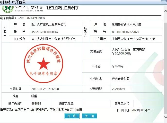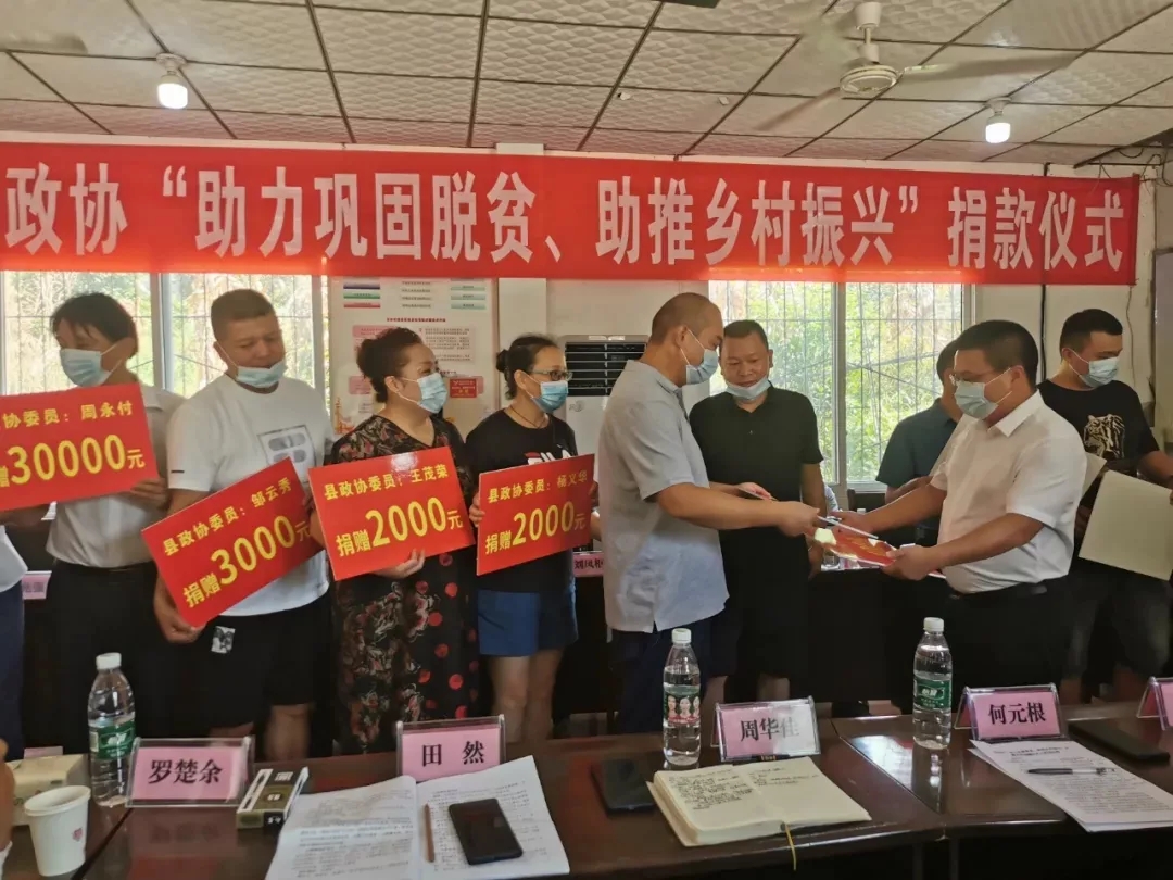 县政协主席刘凤枢出席捐赠仪式并讲话。捐赠仪式上,来自县政协工商界、经济界的市县政协委员和企业家,与镇村干部座谈,了解富新镇、清凉村脱贫攻坚、乡村振兴、产业发展、基础设施建设等情况。市县政协委员和企业家纷纷慷慨解囊,定向为清凉村产业路和安全饮水等基础设施建设捐款,非定向为富新镇捐款,共计捐款15.37万元,助力富新镇、清凉村乡村振兴。我会副会长单位四川久祥建筑工程有限公司捐赠了沐川县富新镇人民政府两万元,用于乡村振兴。